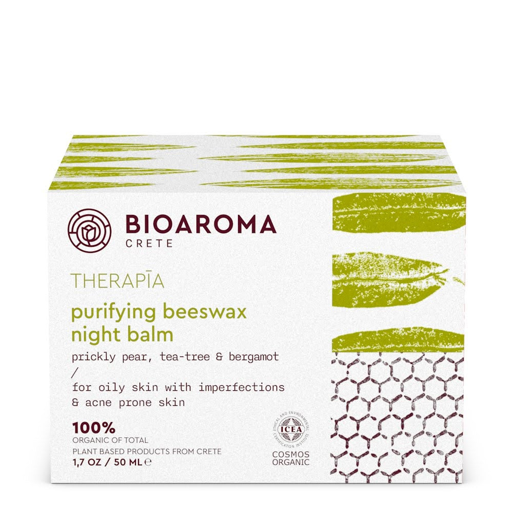 It regulates sebum production. Gives clean skin without imperfections free of acne(διαγραφή). THERAPĪA purifying beeswax night balm is a complete night treatment for oily skin with imperfections & prone acne skin. Regulates the production of sebum. Gives clean skin without blemishes and acne. Its active ingredients penetrate the skin creating a mask of hydration and radiance(διαγραφή). THERAPĪA purifying beeswax night balm works therapeutically helping the natural balance of the skin and creating a healthy glow. The beneficial THERAPIA night balm with(διαγραφή) Ιts four active ingredients works as a beneficial and rejuvenating night mask for oily skin with imperfections and a tendency for acne. Beeswax helps to maintain natural moisture as it creates a protective layer that breathes on the surface of the skin while locking its natural moisture. Prickly pear oil is rich in linoleic acid, which helps to achieve balance in the skin. Its high content of linoleic acid helps to avoid hardening of sebum by preventing the formation of clogged pores that lead to acne and spots.Finally the tea tree contains a number of compounds, including terpinen-4-ol which have been shown to fight pathogenic microorganisms such as bacteria and fungi.