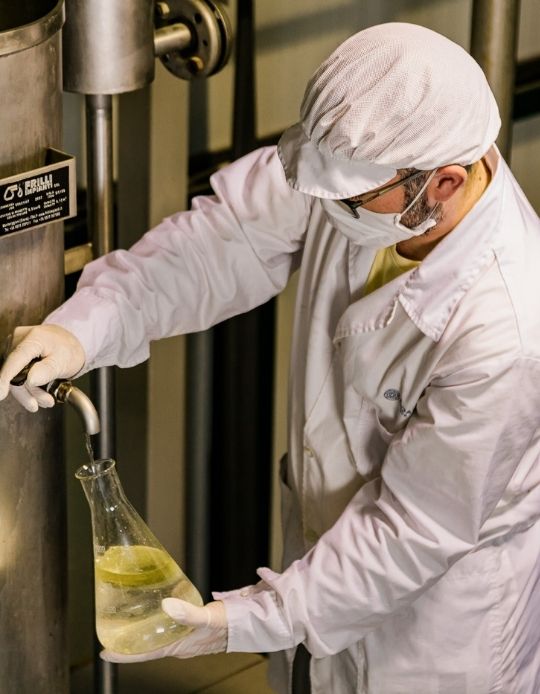 During the steam distillation process, steam passes through the plant material. The combination of heated steam and gentle pressure causes the essential oil to be released from microscopic protective sacs. As the vapor mixture flows through a condenser and cools, it yields a layer of oil and a layer of water. The essential oil rises to the top and is separated from the hydrosol (floral water) and collected.